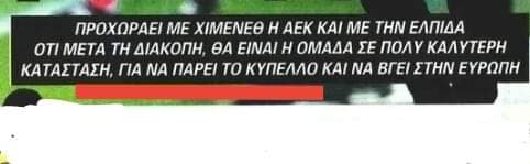«Αν έχετε καταλάβει ξεφτιλιζόμαστε με αυτή την εικόνα. Ξεφτιλίζεται η ΑΕΚ. Και επειδή πρέπει να μιλήσουμε με ειλικρίνεια, αν δεν μπορεί ο προπονητής να μας βοηθήσει να φύγει. Δεν μπορεί να συνεχιστεί άλλο αυτό. Εγώ αυτό έχω να πω εγώ Πέτρο (Μάνταλο)».
