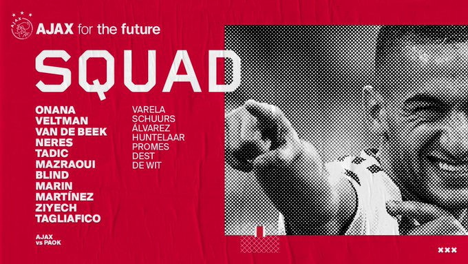 Ονάνα στο τέρμα, ο Μαζραουί δεξιά στην άμυνα με τους Φέλτμαν, Μαρτίνεζ στο κέντρο της άμυνας και ο Ταλιαφίκο αριστερά, οι Φαν Ντε Μπέεκ, Μπλιντ, Μάριν τριάδα στα χαφ. Η επιθετική τριάδα του Αίαντα αποτελείται από τους Νέρες, Τάντις και Ζιγιέχ.