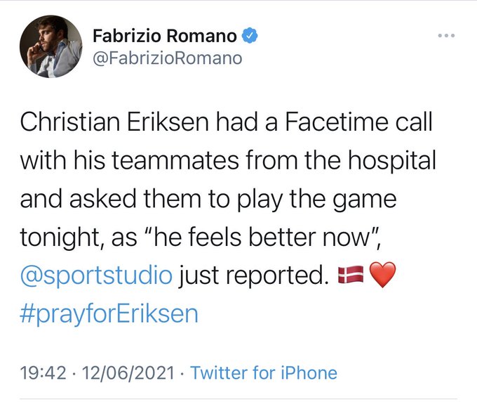 «Σήμερα το πρωί μιλήσαμε με τον Κρίστιαν Έρικσεν, ο οποίος έστειλε χαιρετισμούς σε όλους τους συμπαίκτες του. Η κατάστασή του είναι σταθερή, παραμένει στο νοσοκομείο για περαιτέρω εξετάσεις.