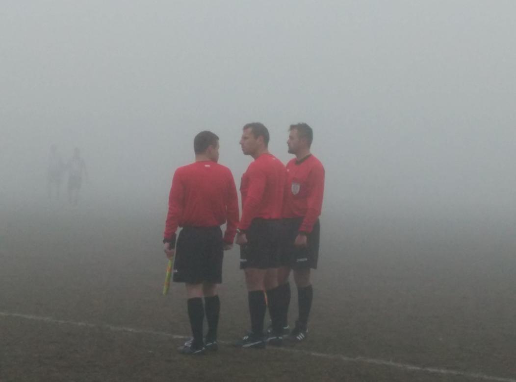 Ο άρχων της αναμέτρησης όμως είχε άλλη άποψη. Έστειλε τις δύο ομάδες για ζέσταμα και ενημέρωσε  τους ανθρώπους αυτών ότι η αναμέτρηση θα ξεκινήσει κανονικά, παρόλο που η προϋπόθεση του κανονισμού για ορατότητα από εστία σε εστία δεν υπήρχε επ’ ουδενί.